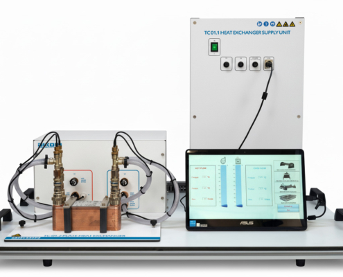 The TC 01.1 equipment is the core of the whole heat exchanger. TC 01.1 is the module that provides hot and cold water to the heat exchangers, in addition to measuring the temperatures and flow rates for each device.