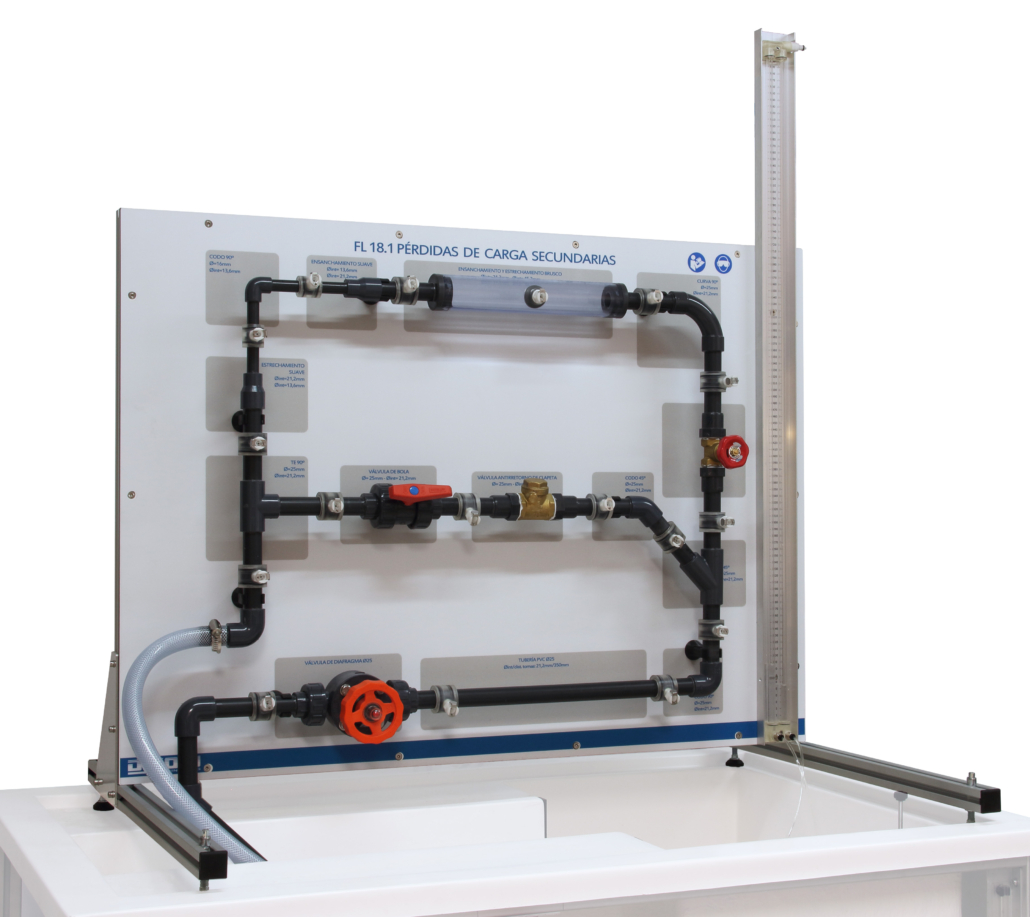 Esta instalación para el estudio de las pérdidas de carga cuenta con tramos rectos de tubería, lo que permite el estudio de la pérdida primaria generada en la misma. Además dispone de elementos tales como codos de diferentes diámetros a 90º y 45º, tes, ensanchamientos, estrechamientos, válvulas de distintas tipologias (bola, compuerta, membrana, antirretorno,…) con tomas de presión aguas arriba y debajo de los mismos dispuestos para la determinación de la pérdida de carga entre tomas producida con diferentes caudales de circulación.